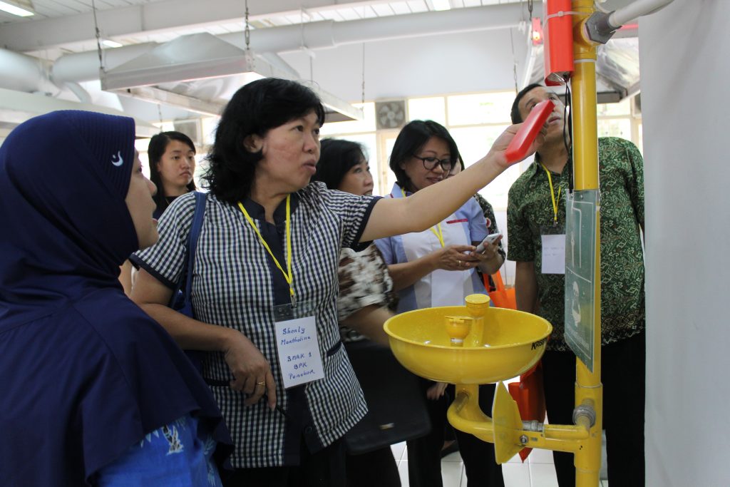 Peserta pelatihan melihat fasilitas safety dasar di laboratorium Kimia Terapan UNPAR