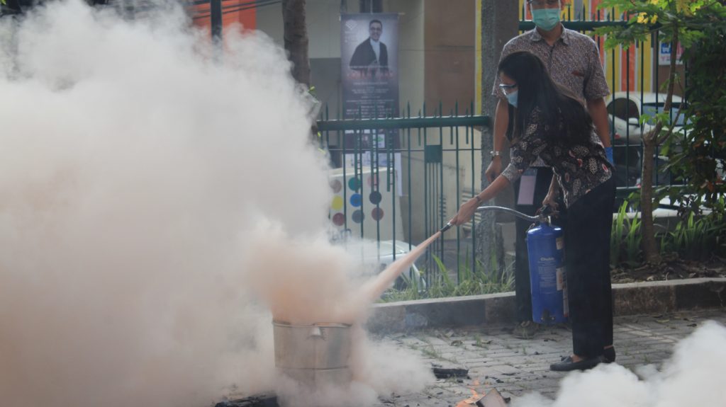 Peserta pelatihan mencoba memadamkan api dengan APAR portabel