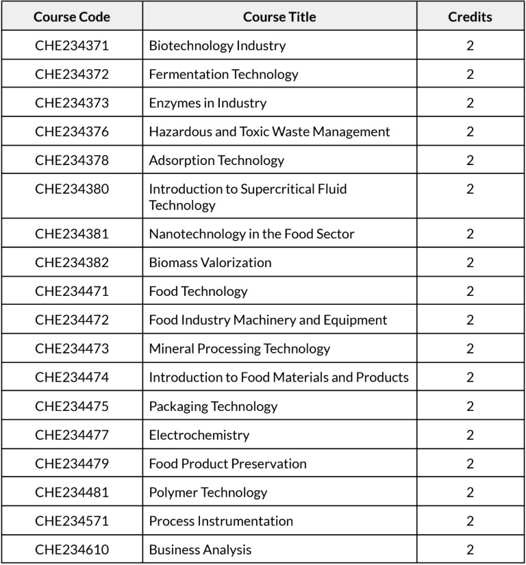 Students in the General Chemical Engineering concentration program can choose mandatory Chemical Business Development concentration courses as elective courses.