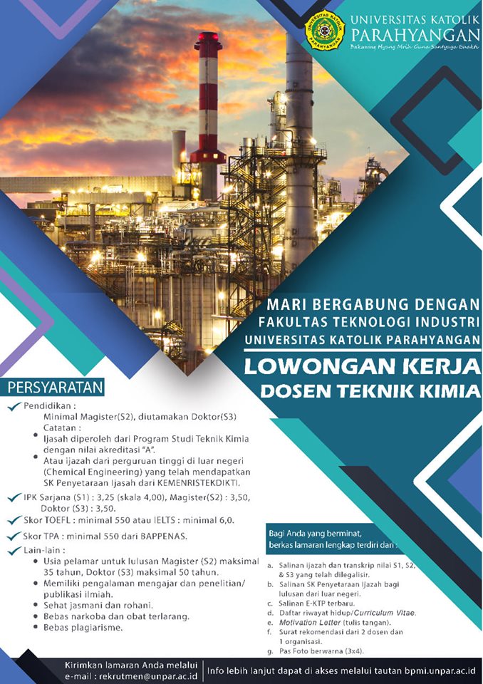 Dibuka lowongan pekerjaan sebagai dosen Teknik Kimia UNPAR bagi calon yang memenuhi persyaratan, terlampir. Kirimkan lamaran anda melalui email rekrutment@unpar.ac.id . Informasi lebih lanjut dapat diakses di bpmi.unpar.ac.id