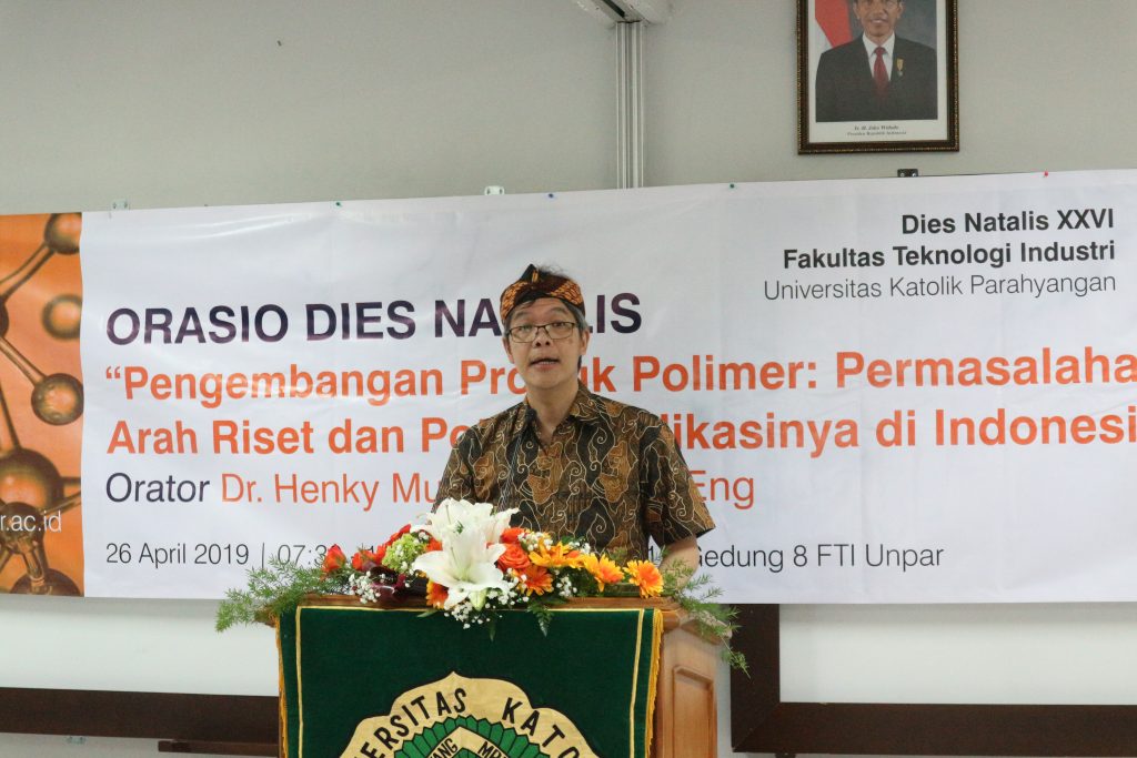 Pada acara Dies Natalis Fakultas Teknologi Industri ke-26, Dr. Henky Muljana, S.T., M.Eng. menyampaikan orasi ilmiahnya yang berjudul “Pengembangan Produk Polimer: Permasalahan, Arah Riset dan Potensi Aplikasinya di Indonesia”.
