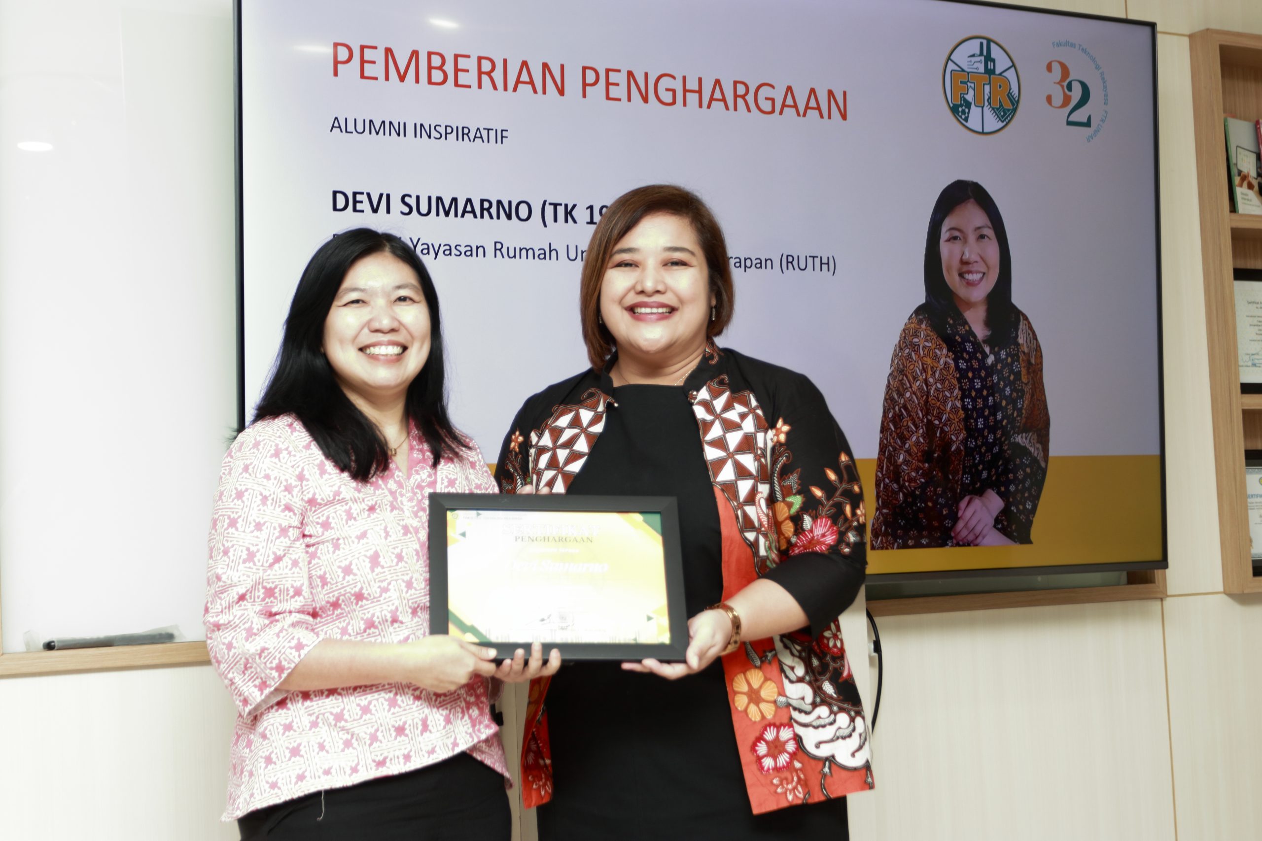 Dalam acara Forum Akademik yang diadakan dalam rangka memperingati hari jadi Fakultas Teknologi Rekayasa (FTR) yang ke-32, Dekan FTR UNPAR memberikan penghargaan Alumni Inspiratih kepada Devi Sumarno, alumni Prodi Sarjana Teknik Kimia angkatan 1998. Penghargaan diberikan atas kontribusi yang luar biasa oleh Devi Sumarno dalam bidang kemanusiaan. Devi merupakan pendiri Yayasan Rumah Untuk Tumbuh Harapan (https://rumahruth.or.id/), atau yang umum dikenal sebagai Rumah Ruth, bersama suaminya Charles Wong. Rumah Ruth bertujuan memberikan dukungan dan kesempatan bagi perempuan yang mengalami kehamilan tidak diinginkan untuk dapat melahirkan dan merawat bayinya tanpa aborsi.
