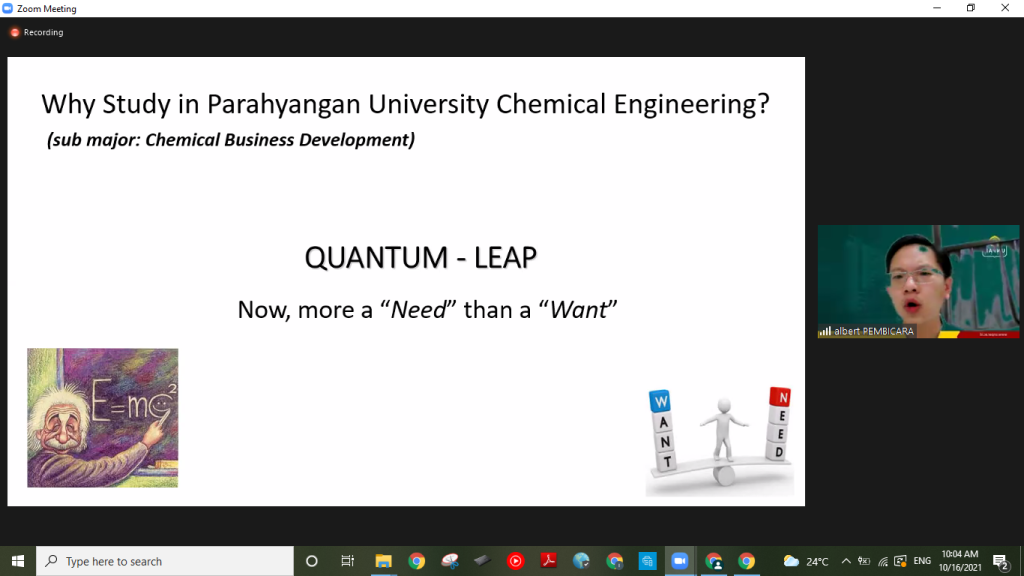 Pada Sabtu (16/10/2021), Program Chemical Business Development (CBD) Teknik Kimia Universitas Katolik Parahyangan (TK UNPAR) mengadakan webinar bertajuk “Profesi Business Development bagi Lulusan Teknik Kimia” yang dimoderatori oleh Budi Husodo Bisowarno (Dosen TK UNPAR). Webinar ini mengundang Albert Tjahjadi (Head of Sales and Development di ULA dan Alumni TK UNPAR tahun 2000) untuk membahas mengenai langkah-langkah lulusan TK yang akan berkecimpung dalam pengembangan bisnis. Webinar ini dihadiri oleh berbagai kalangan mulai dari para dosen, mahasiswa, hingga guru dan siswa SMA.