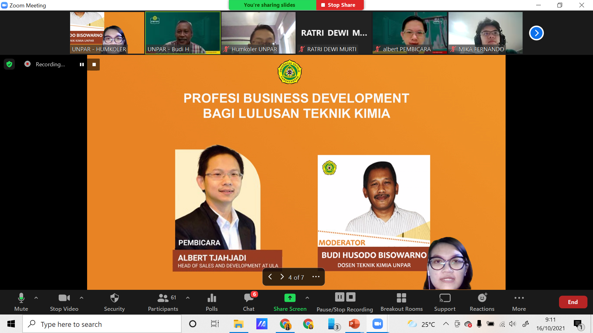 Pada Sabtu (16/10/2021), Program Chemical Business Development (CBD) Teknik Kimia Universitas Katolik Parahyangan (TK UNPAR) mengadakan webinar bertajuk “Profesi Business Development bagi Lulusan Teknik Kimia” yang dimoderatori oleh Budi Husodo Bisowarno (Dosen TK UNPAR). Webinar ini mengundang Albert Tjahjadi (Head of Sales and Development di ULA dan Alumni TK UNPAR tahun 2000) untuk membahas mengenai langkah-langkah lulusan TK yang akan berkecimpung dalam pengembangan bisnis. Webinar ini dihadiri oleh berbagai kalangan mulai dari para dosen, mahasiswa, hingga guru dan siswa SMA.