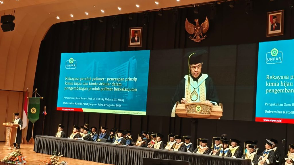 Pada hari Rabu, 7 Agustus 2024, diadakan Sidang Terbuka Senat Universitas Katolik Parahyangan dalam rangka Pengukuhan Guru Besar Teknik Kimia di bidang Rekayasa Produk Polimer, Prof. Dr. Ir. Henky Muljana, S.T., M.Eng, bersamaan dengan Pengukuhan Guru Besar Teknik Mekatronika, Prof. Dr. Ir. Bagus Made Arthaya, M.Eng. Dalam kesempatan tersebut, Prof. Henky menyampaikan pidato pengukuhannya yang berjudul Rekayasan Produk Polimer: Penerapan Prinsip Kimia Hijau dan Kimia Sirkular dalam Pengembangan Produk Polimer Berkelanjutan.