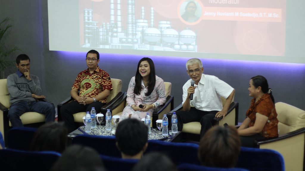 Sesi talk show Seminar Keprofesian Teknik Kimia 2017 (dari kiri ke kanan: Aditiyo Ramadhan, ST (Piping and Process Engineer, WILMAR Group), Ir. Andreas Deny (Process Engineering Lead, PT Pertamina Hulu Energi), Mitra Aviani, STP, MT (Peneliti Pertama PJU Pemasaran Teknologi, LEMIGAS), Ir. Abdul Wahab (CV Anugerah Karya Insani), dan Jenny N M Soetedjo, ST, MSc.)